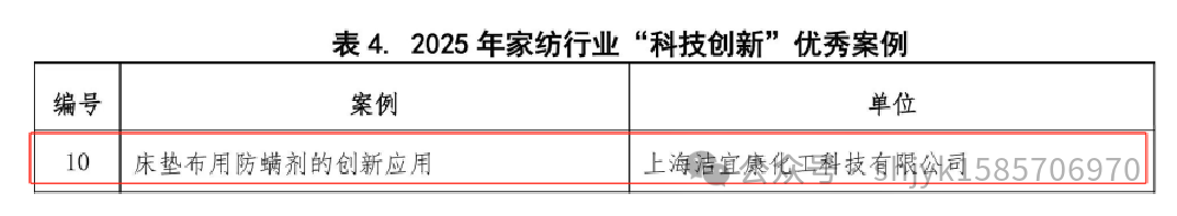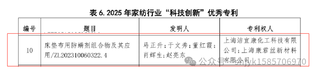 2025年中国家纺行业科技创新评选中,上海洁宜康化工科技有限公司凭借“床垫布用防螨剂的创新应用”项目与专利技术ZL202310060322.4《床垫布用防螨剂组合物及其应用》脱颖而出,同时斩获“科技创新优秀案例”与“科技创新优秀专利”两项殊荣。这一成就不仅彰显了企业在功能性助剂领域的深厚技术积淀,更以高效、安全、长效的解决方案重新定义了家居健康防护标准,为行业技术升级树立了标杆。