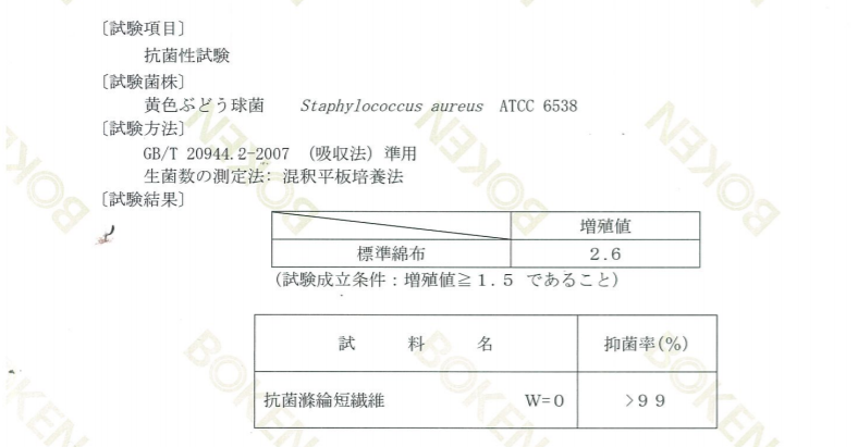 本产品在最终成品织物中的混用量达到30%以上时,才具有良好的抗菌性能、防螨性能和良好的耐洗涤性能。