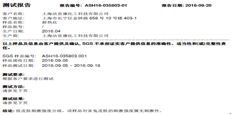 舒热丝®繊維は安全性が高く、皮膚への刺激がありません。 SGS試験報告書は次のとおりです。